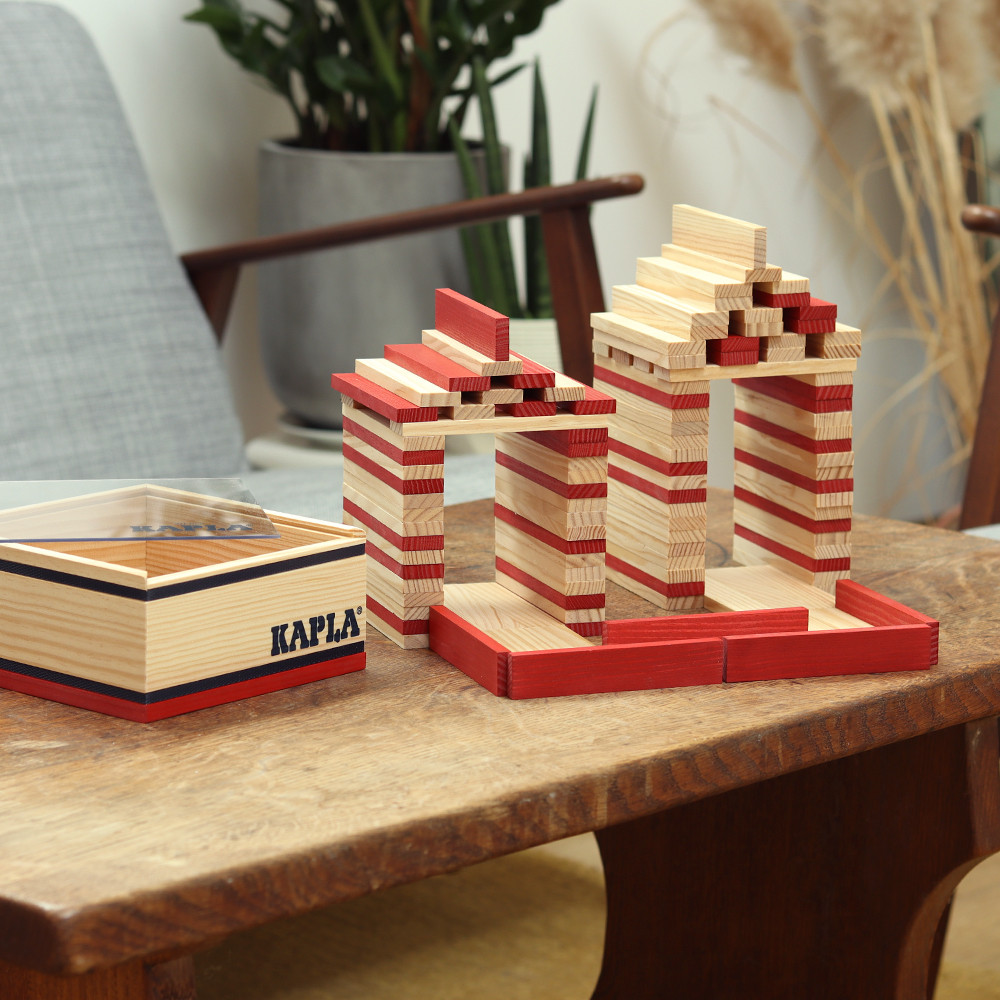 Die KAPLA-Plättchen sind aus naturbelassenem, nachhaltigem Pinienholz (Seekiefer) gefertigt, das aus französischen, zu 100% nachhaltig bewirtschafteten Wäldern stammt. Die farbigen Holzplättchen sind mit lebensmittelechter Farbe gefärbt.
