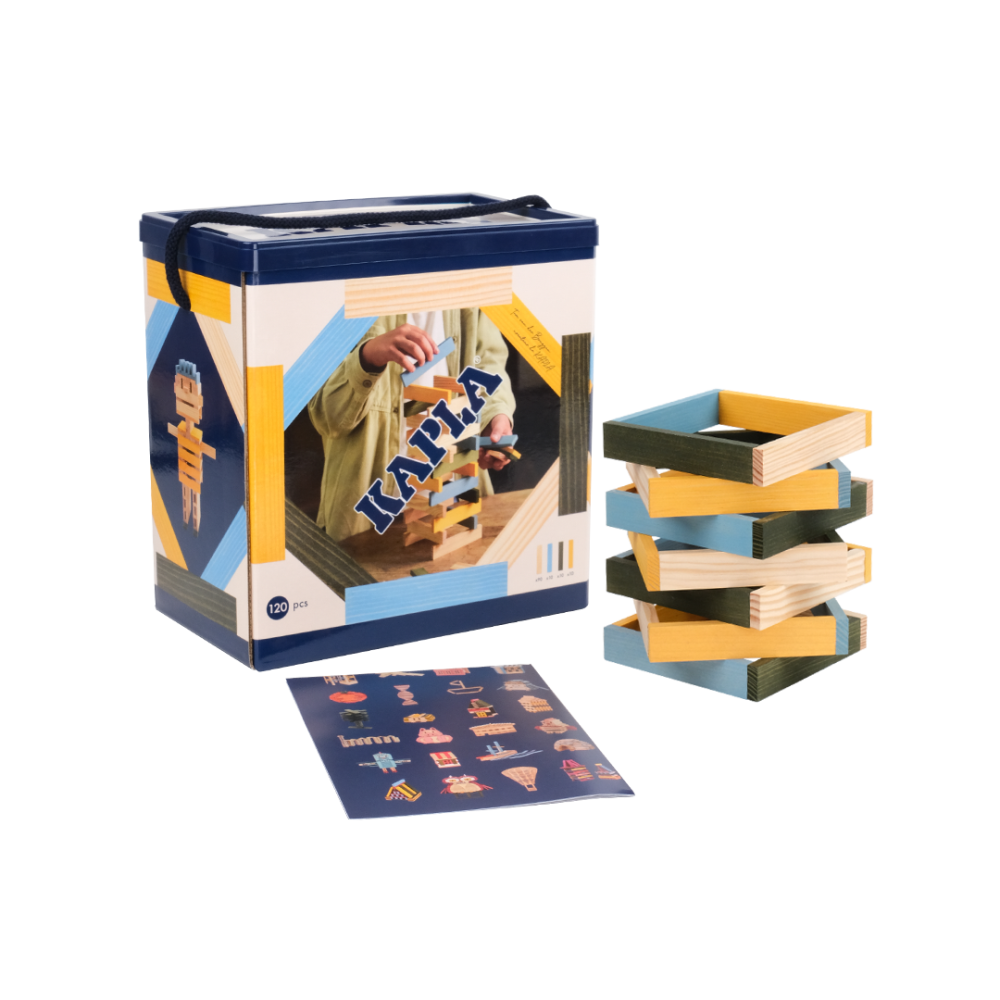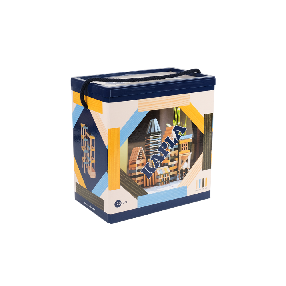 Die 120er Box von KAPLA® enthält 120 Holzplättchen, davon 30 farbige Plättchen - farbenfrohe Kleinformate !