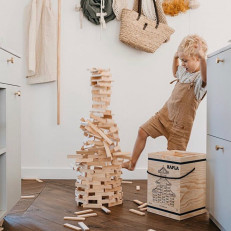 Met de KAPLA-plankjes met identieke afmetingen kan oneindig worden gespeeld en gecreëerd. De plankjes worden eenvoudigweg gestapeld, zonder lijm of bevestiging en kan je bouwen wat in je hoofd opkomt… Een KAPLA-werkje is vergankelijk van nature, en het afbreken is soms net zo prettig als het bouwen. De volgende dag ontstaan met dezelfde plankjes een nieuw universum en andere denkbeeldige structuren…